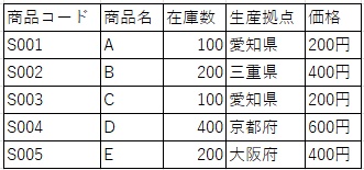 例えば、以下のテーブルにおいて、主キーは「商品コード」になります。