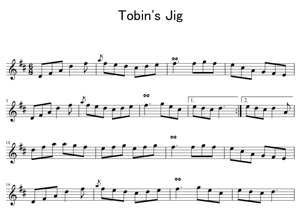 Tobin's Jigは、初心者向けの曲として多くのフィドル入門者に演奏される曲です。