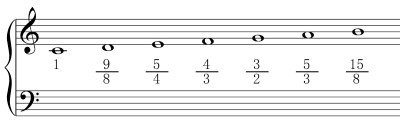 純正律による長調(メジャー調)は、純正完全5度 (3/2) と純正長3度 (5/4) を用いて音階を定めます。