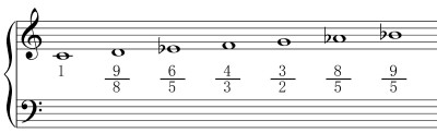 純正律による短調(マイナー調)は、純正完全5度 (3/2) と純正短3度 (6/5)を用いて音階を定めます。