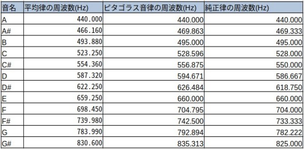 平均律の周波数とピタゴラス音律、純正律の周波数を比較すると下記のようになります。