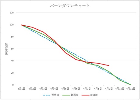 実績線とは、プロジェクトの残作業量を表し、進捗状況を把握するための線です。