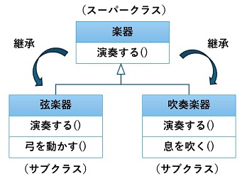 継承される既存のクラスを「スーパークラス」、継承した新しく作ったクラスを「サブクラス」といいます。