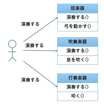 多態性のメリットは、命令メッセージを送る側の手間を省くことです。呼び出される側のクラスを変更しても、呼び出し元のクラスに影響しません。