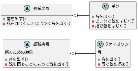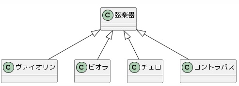上図では、弦楽器をスーパークラスと呼び、各楽器パートをサブクラスと呼びます。