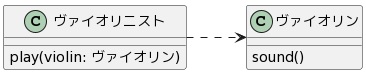 依存の例として、ヴァイオリンを弾くヴァイオリニストと、ヴァイオリンの関係を表すクラスを考えます。