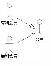 アクター同士、ユースケース同士を繋ぐ先端に白抜き三角形を加えた実線で表記します。