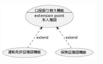 ユースケース図における拡張は、あるユースケースが他のユースケースを(条件付きで)利用するという表現ができます。、