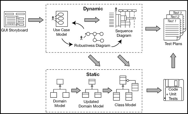 動的モデルでは、システムの要求をUMLユースケース図で可視化し、ロバストネス図を使用してシステムの動的な振る舞いを明確にしながら、ユースケースの修正を重ねていきます。