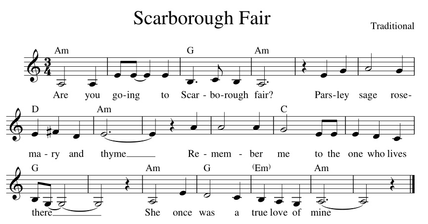 スカボローフェアは、16 世紀頃のイングランドのブロードサイド・バラッド(伝承歌)を源流とするトラディショナルであり、作曲者は不明です。