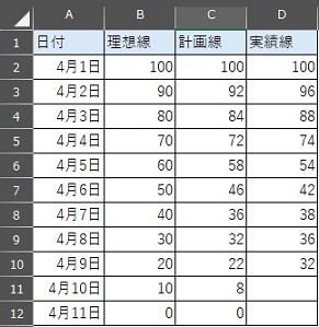 エクセルで、日付、理想線、計画線、実績線の列を定義します。