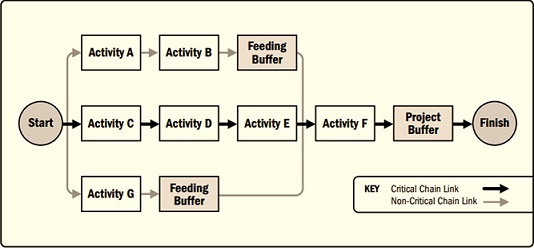 クリティカルパス法とは異なり、工程間の繋がりにおいて「リソース(担当者や担当チーム、設備、資材など)が競合する工程は並行に進めることができない」という前提を取り入れている点が特徴です。