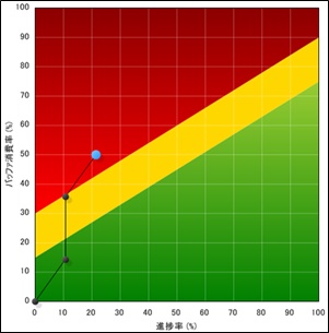 傾向グラフは、バッファの消費率の危険度ごとに、「緑:安全、黄:注意、赤:危険」と色分けしています。