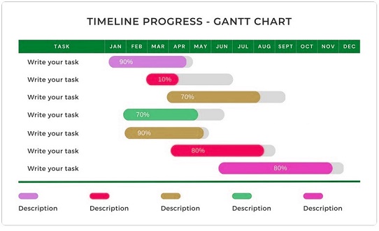 ガントチャートとは、縦軸にタスクの内容や担当者などを記載し、横軸に作業の進捗率を記載した、作業に必要な期間を横棒の長さで表記する図法です