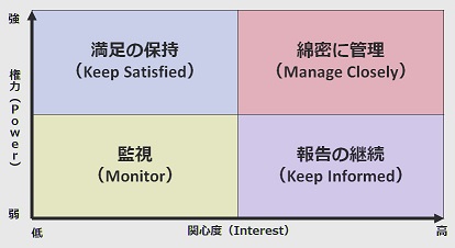 - 綿密に管理(右上):この重要なステークホルダーとは密接に関わり、彼らのニーズや要望を満たすべくあらゆる努力をすべきです。