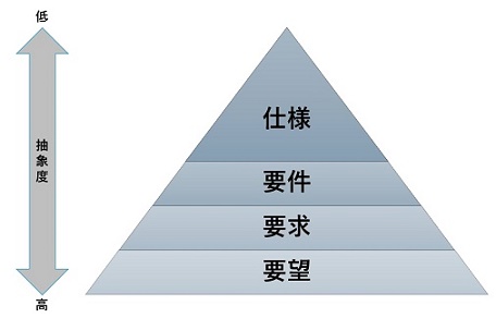 システム開発では、抽象度の高い要望を、要求・要件と具体化していき、仕様を明確化していきます。
