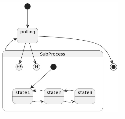 深い履歴は、記載された状態の中と、その中のすべての状態の状態遷移を保存して、次回再開した時に同じ状態に戻る機能を表現します。
